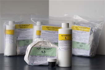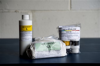 The kit is a 2-part liquid and powder water based acrylic gypsum resin.