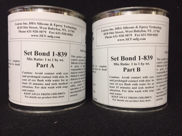 Set-Bond 839 is a thixotropic paste epoxy adhesive with adjustable flexibility and can be cured at room temperature or at elevated temperatures. Set-Bond flexibility is determined by the amount of part B used. Set-Bond 839 exhibits a good mechanical bond, peel strength and thermal shock resistance with adhesion to glass, ceramics, metals and plastics.